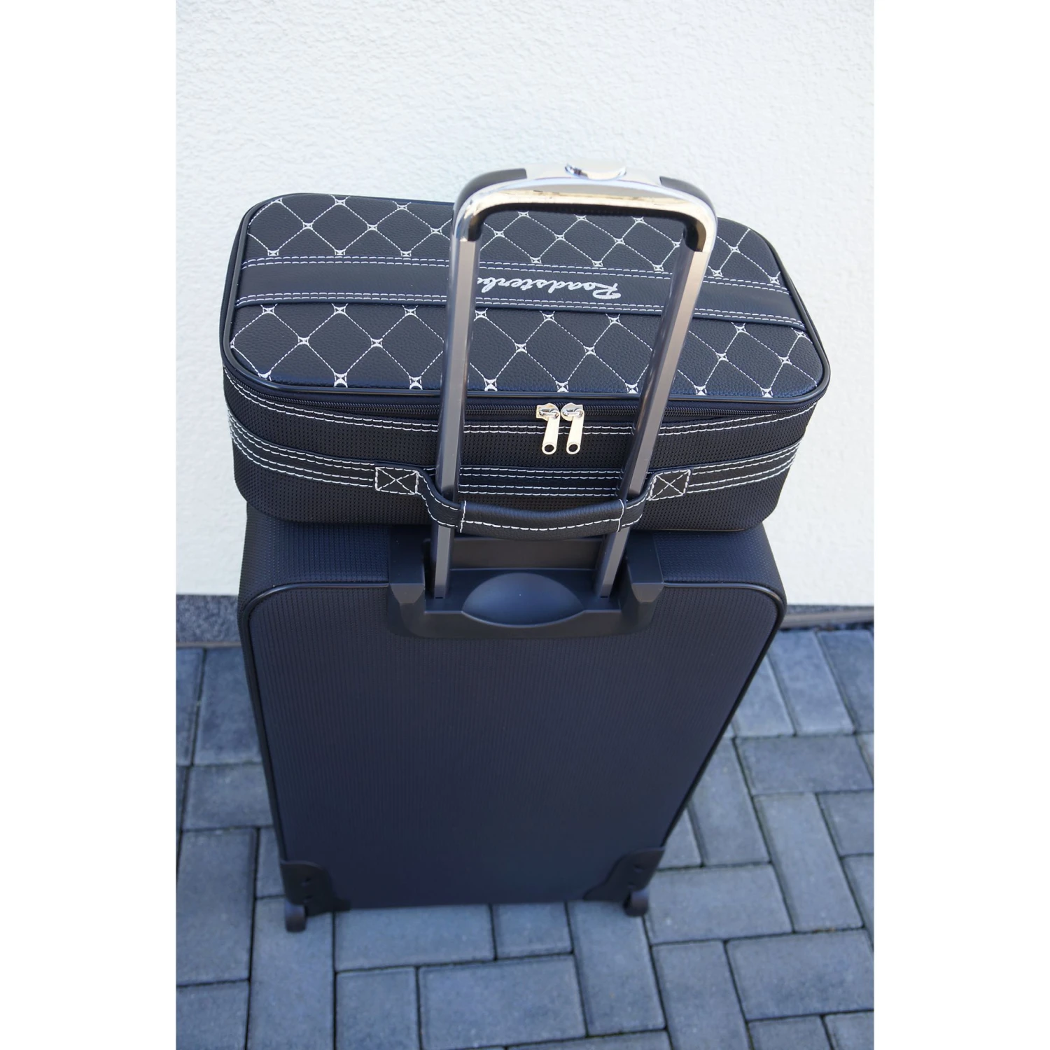 Mit zwei bequem manövrierbaren Trolleys und zwei passenden Taschen für den Rücksitz ist das vierteilige Auto-Kofferset von Roadsterbag die ideale Gepäcklösung für Ihr Mercedes E-Klasse Coupé. Handgefertigt in der EU, gefallen die eleganten Gepäckstücke mit einem hochwertigem Design aus speziellem Koffernylon und Details aus echtem, italienischem Leder. Dekorative Ziernähte, Fronten mit edlem Rautenmuster und ein Premium-Innenfutter aus Ancarra-Mikrofaser runden den exklusiven Look hervorragend ab und garantieren einen stilsicheren und eleganten Auftritt.