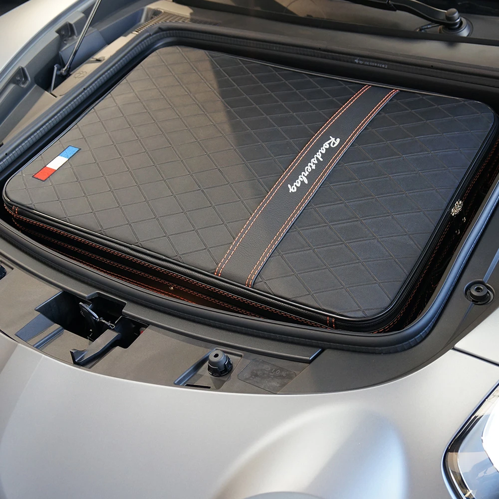 Der hochwertige Trolley für den vorderen Kofferraum des Alpine A110 wird aus hochwertigem Kunstleder aus dem Automobilbau und mit Echtleder-Applikationen gefertigt. Die Griffe sind aus italienischem Leder. Der Leichtbau-Rahmen des Koffers sorgt für Stabilität und leichte Handhabung, das gestickte Logo, wählbare farbige Nähte und feines Innenfutter aus Ancarra®-Mikrofaser verleihen ihm eine edle Optik. Der Trolley verfügt über einen abschließbaren Deckel mit Innenfach (mit Reißverschluss) und Spannbänder für die Fixierung des Kofferinhaltes, damit bei der Reise nichts verrutscht. Mit dem voll versenkbarem Griff und den kugelgelagerten und verchromten Felgen mit extrabreiten Reifen lässt sich der Trolley auch im vollen Zustand einfach fortbewegen.