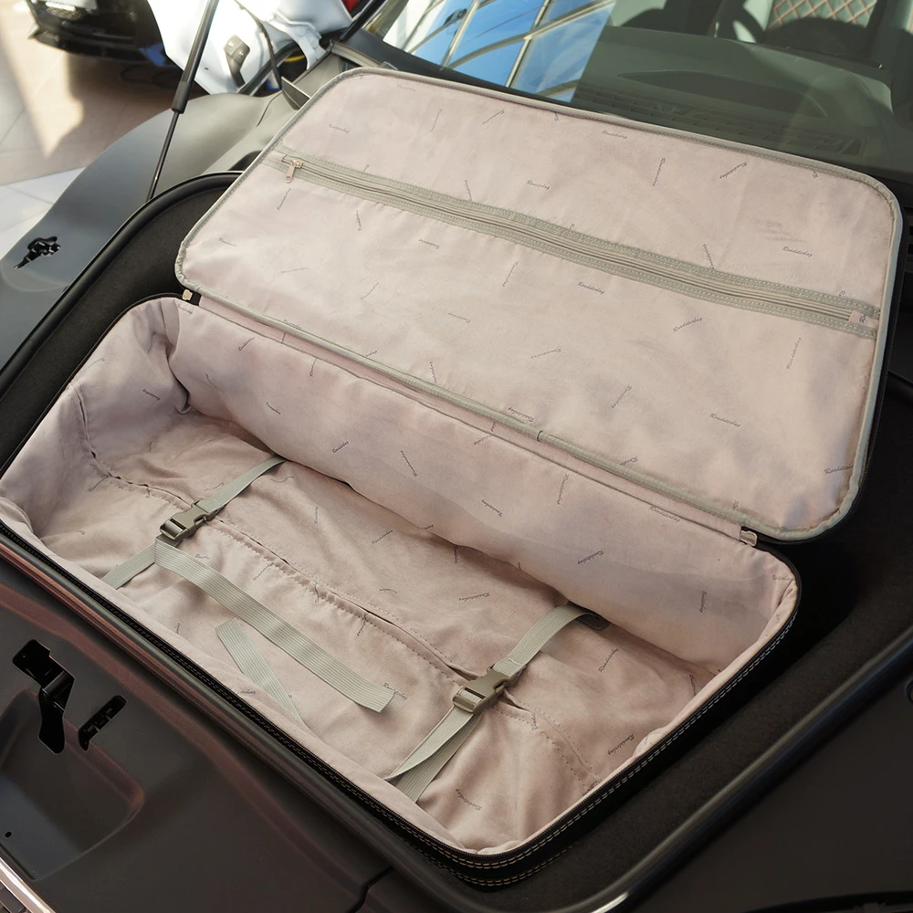 Dieses zweiteilige Kofferset ist die ideale Wahl, wenn Sie mit Ihrem Audi R8 4S Spyder gerne Ausflüge mit großem Gepäck unternehmen. Die zwei praktischen Koffer passen durch ihr Design perfekt in den Kofferraum Ihres Wagens. Hergestellt aus italienischem Leder mit einem hochwertigen Innenfutter aus Ancarra®-Mikrofaser und luxuriöser Stickerei sind diese Gepäckstücke optisch absolut gelungen. Ein innovativer Metall-Kunststoff-Verbundrahmen sorgt für die nötige Stabilität. Dank bequemer Tragegriffe lassen sich die Koffer komfortabel transportieren.