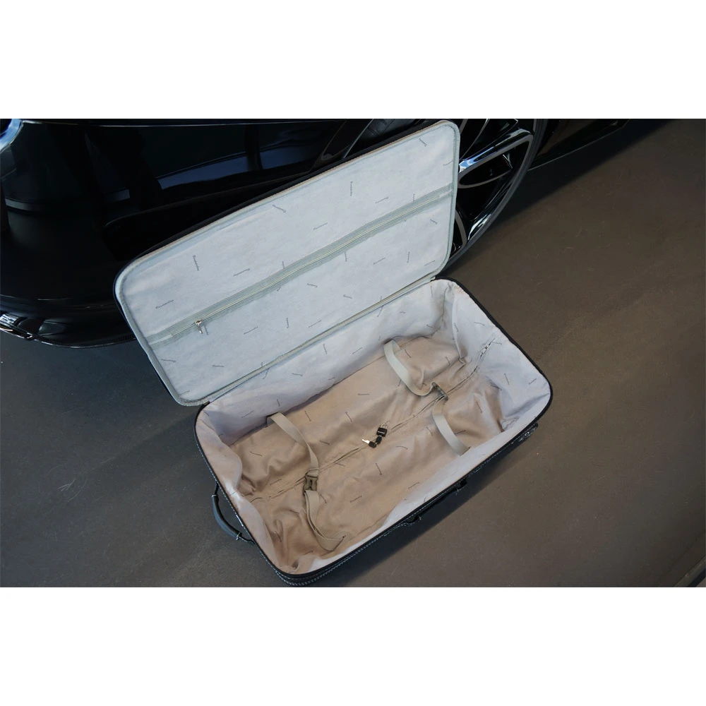 Dieses 4-teilige Kofferset wurde speziell für das Continental GT Coupé von Bentley entwickelt und passt exakt in den Kofferraum, ohne Platz zu verschwenden. Die Dachmechanik wird nicht beeinträchtigt, so dass Sie mit maximalem Gepäck und offenem Dach auf Tour gehen können. Die Trolleys verfügen über einen abschließbaren Deckel mit Innenfach (mit Reißverschluss) und Spannbänder für die Fixierung des Kofferinhaltes, damit bei der Reise nichts verrutscht. Mit dem voll versenkbarem Griff und den kugelgelagerten und verchromten Felgen mit extrabreiten Reifen lassen sich die Trolleys auch im vollen Zustand einfach fortbewegen. Der Leichtbau-Rahmen der Koffer sorgt für Stabilität und leichte Handhabung, das gestickte Logo, wählbare farbige Nähte und feines Innenfutter aus Ancarra®-Mikrofaser verleihen dem Set eine edle Optik. Die eleganten Taschen bieten mit einem großzügig bemessenem Inneren viel Stauraum für alles Nötige was für eine Reise gebraucht wird.