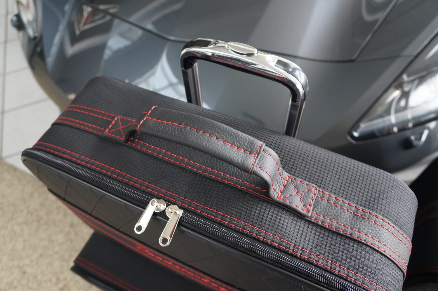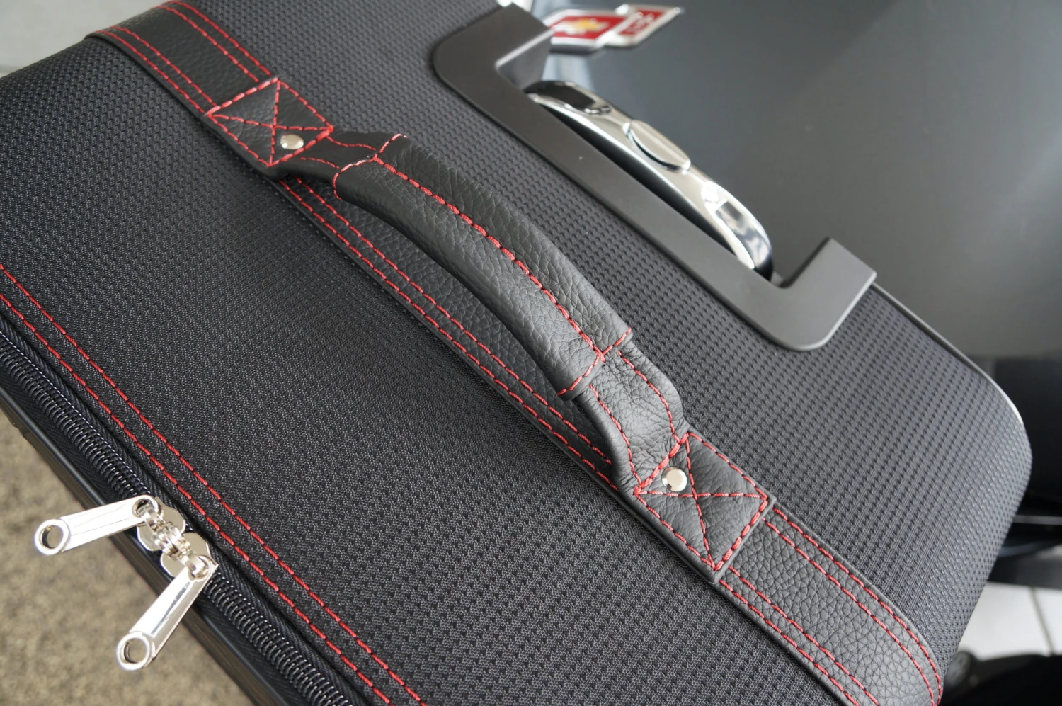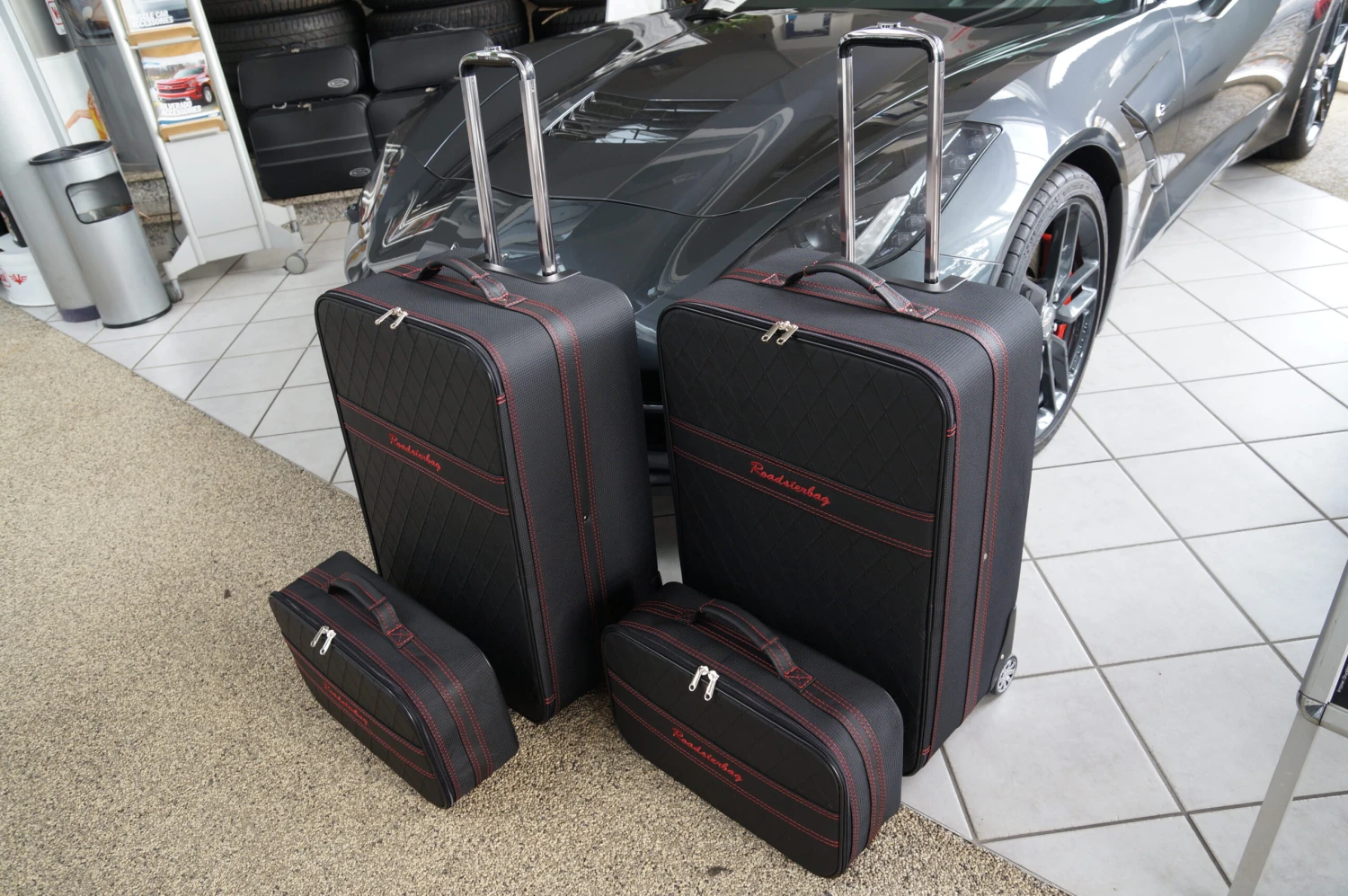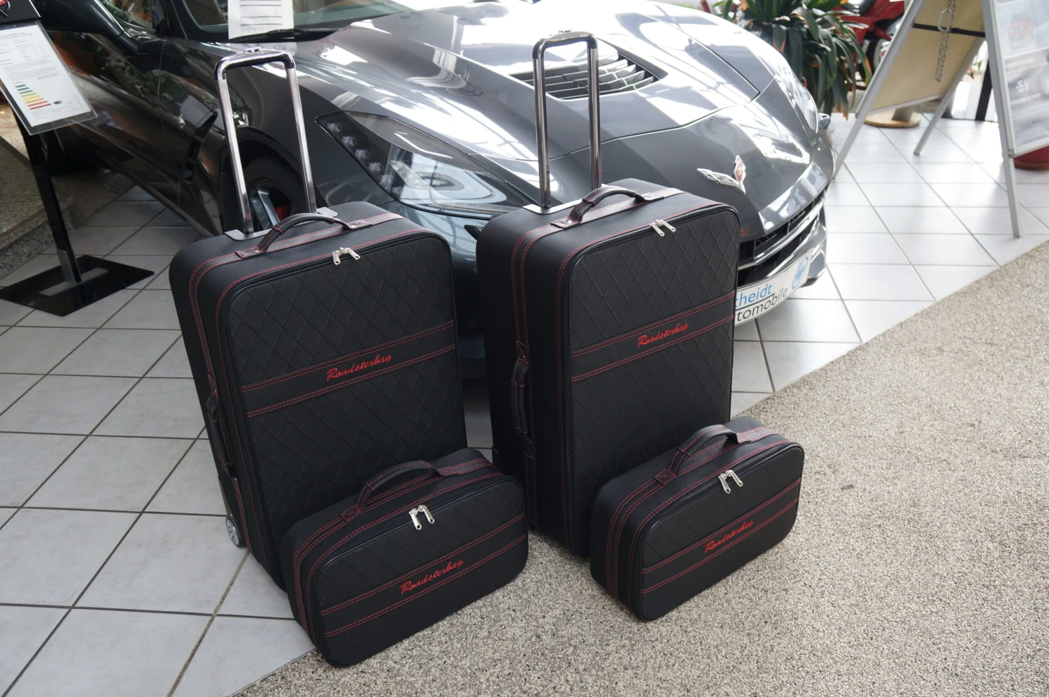 Dieses vierteilige Kofferset von Roadsterbag ist speziell auf den Kofferraum des Chevrolet Corvette C7 Coupé zugeschnitten. Die Trolleys und die passenden Koffer nutzen den vorhandenen Stauraum optimal aus. Die Trolleys sind mit voll versenkbarem Griff, silikongedämpften, verchromten Laufrollen, Kugellagerung und Inside-Trolley-Technik aus leichtem Aluminium ausgestattet. Die erstklassige Verarbeitung und das hochwertige Innenfutter aus edler Ancarra-Mikrofaser verleihen dem Set eine edle Optik, die sich nahtlos in das Innendesign Ihres Wagens einfügt. Dank bequemer Tragegriffe und stabilem Rollensystem lassen sich die Gepäckstücke komfortabel transportieren.