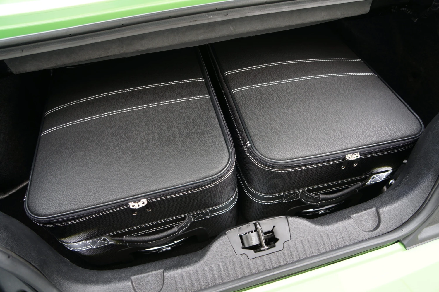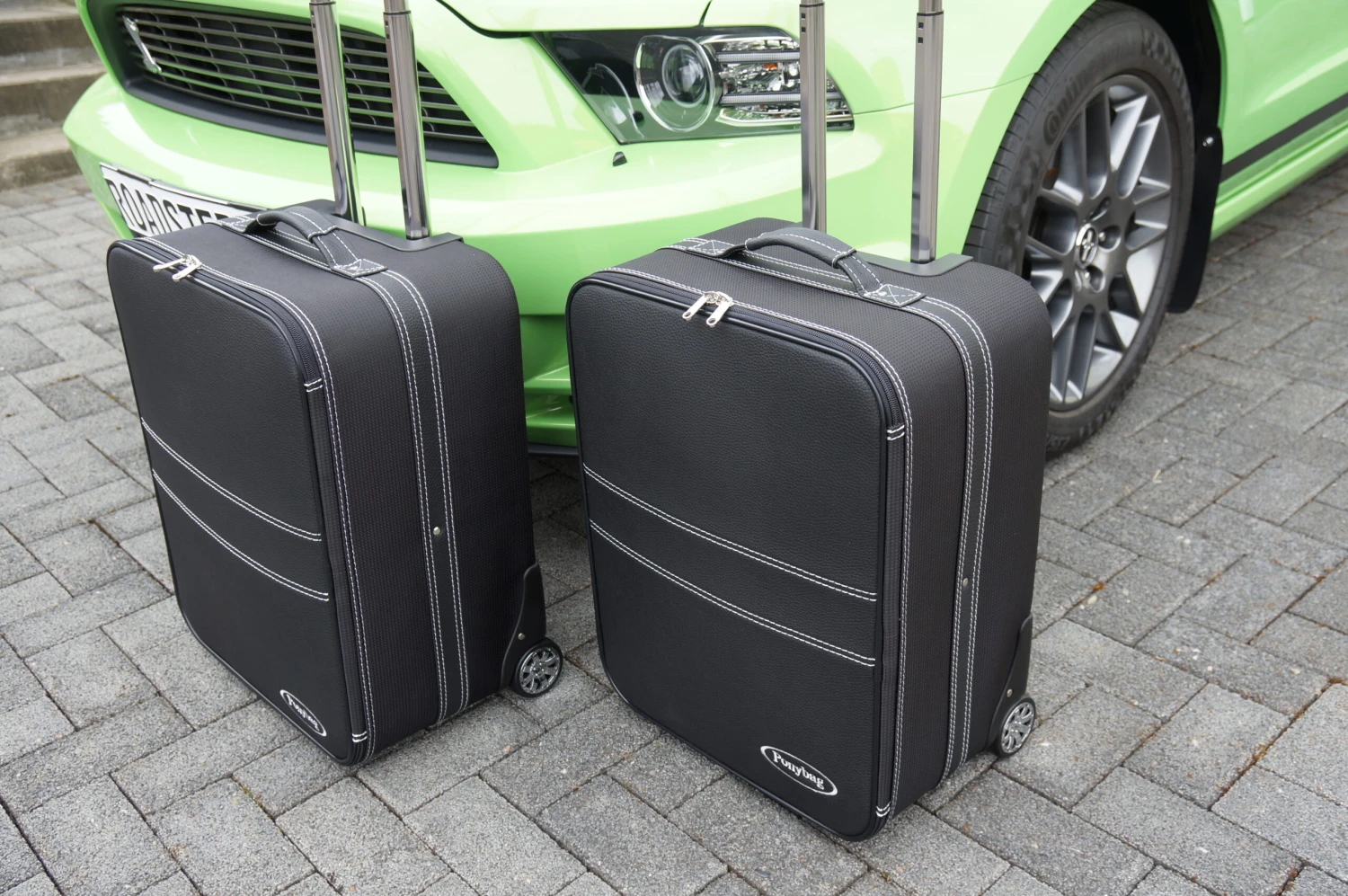Dieses zweiteilige Kofferset von Roadsterbag ist speziell auf den Kofferraum des Ford Mustang V Cabrio (2005-2014) zugeschnitten. Die Trolleys sind mit voll versenkbarem Griff, silikongedämpften, verchromten Laufrollen, Kugellagerung und Inside-Trolley-Technik aus leichtem Aluminium ausgestattet. Die erstklassige Verarbeitung und das hochwertige Innenfutter aus edler Ancarra-Mikrofaser verleihen dem Set eine edle Optik, die sich nahtlos in das Innendesign Ihres Wagens einfügt. Dank bequemer Tragegriffe lassen sich die Gepäckstücke komfortabel transportieren.