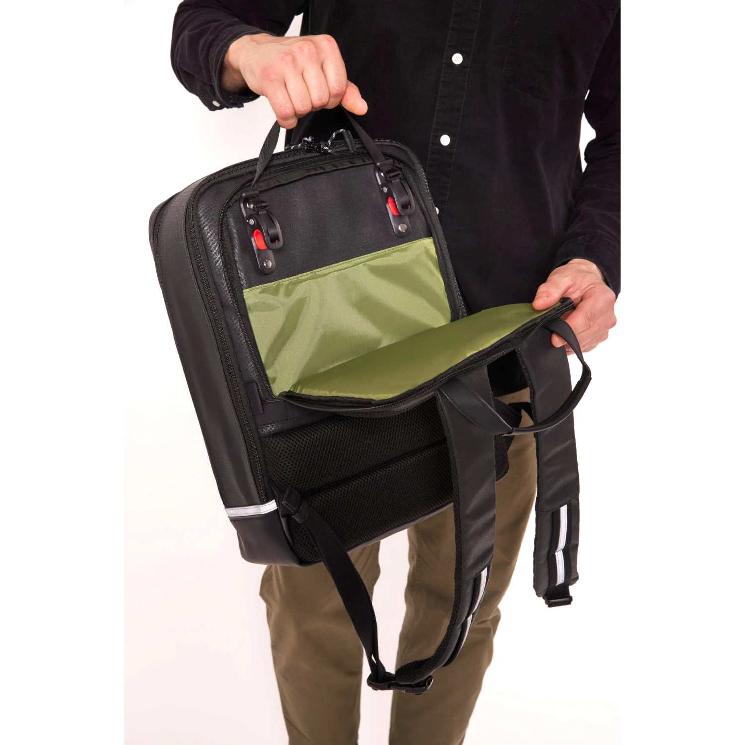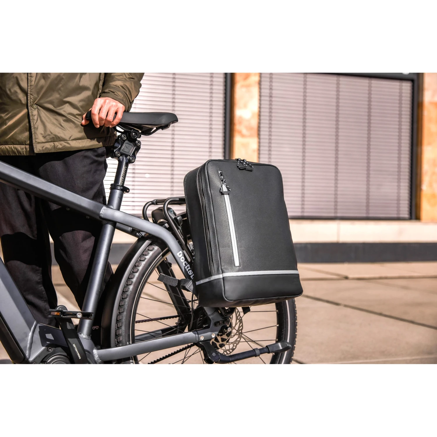 Eine innovative Ergänzung ist die neue „Clip-On“-Funktion, mit der du die Tasche nicht nur bequem über der Schulter oder in der Hand tragen, sondern auch am Gepäckträger deines Fahrrads befestigen kannst. Diese clevere Funktion ist auf der Rückseite des Rucksacks geschickt verdeckt untergebracht und bietet dank der Polsterung zusätzlichen Komfort, wenn du den Rucksack auf dem Rücken trägst.